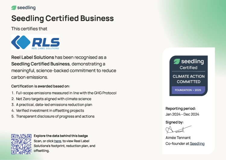At Reel Label Solutions we’re committed to minimising our own impact on the environment and promoting sustainability in everything we do. We’ve committed to working with an external adviser (Seedling) to conduct a complete, verified carbon footprint – covering our entire operations and supply chain – and putting in place a robust, evidence-backed plan to reduce our emissions over the long-term.